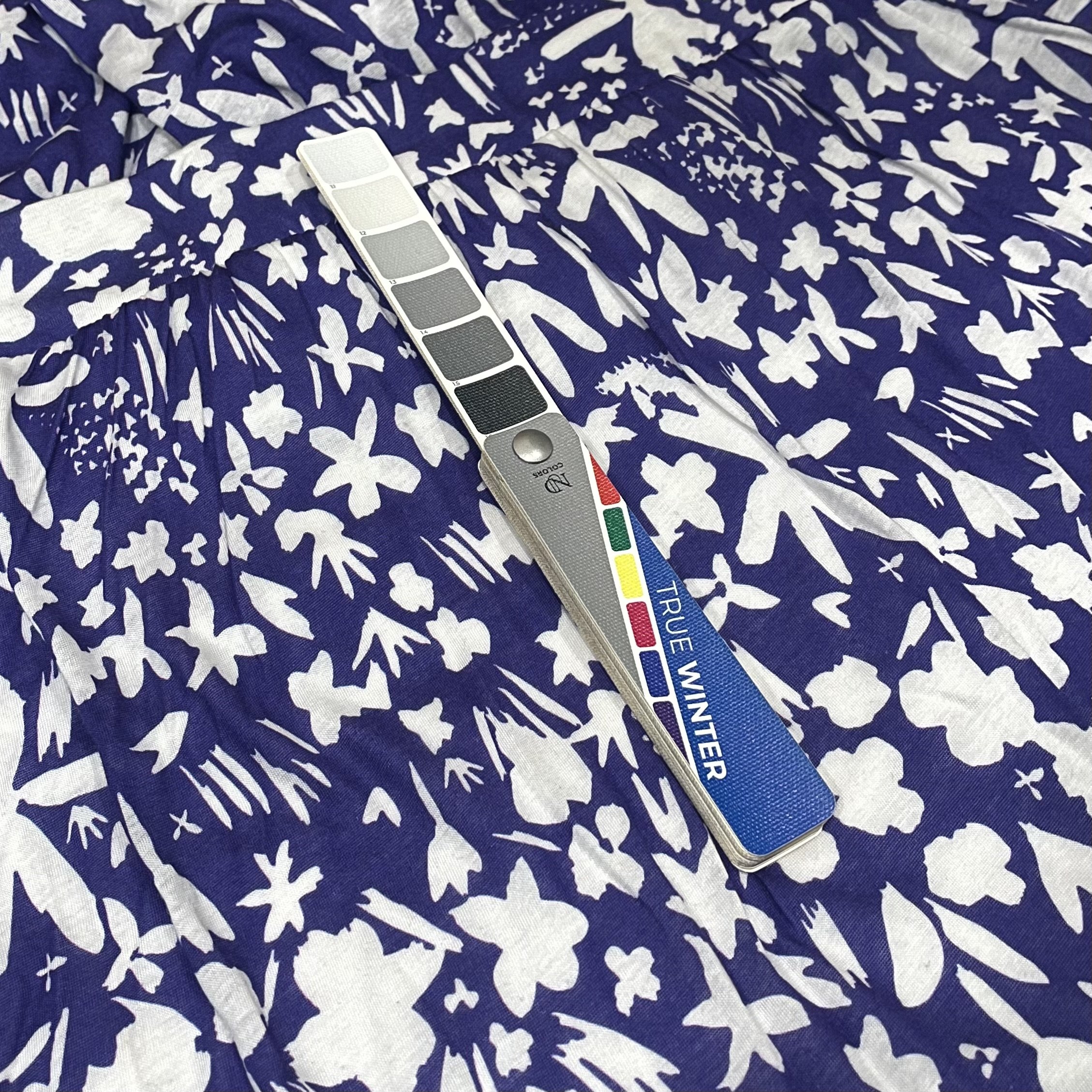 Color fans are available from many different sources. My favorite—and the one I use in my studio—comes from NDU Colors (if you want to purchase one of your own, use code KIGOCOLOR for 10% off.) A color fan provides you with a sampling of your season’s best colors. It does not contain every single shade that you will find in clothing—think of it as the possibility space and average of what your colors will look like in the real world.